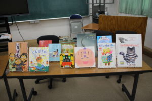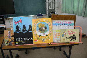 絵本『じゅげむ』・『ともだちや』、紙芝居『ねこのおかあさん』、大型絵本『すてきな三にんぐみ』・『てぶくろ』・『ノラネコぐんだんパンこうじょう』の6冊を読んでいただきました。