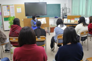 生徒たちは「図書館がすすめる読み聞かせの本」の冊子をもらい、読み聞かせをする時の本の選び方や練習の大切さなどアドバイスをもらいました。