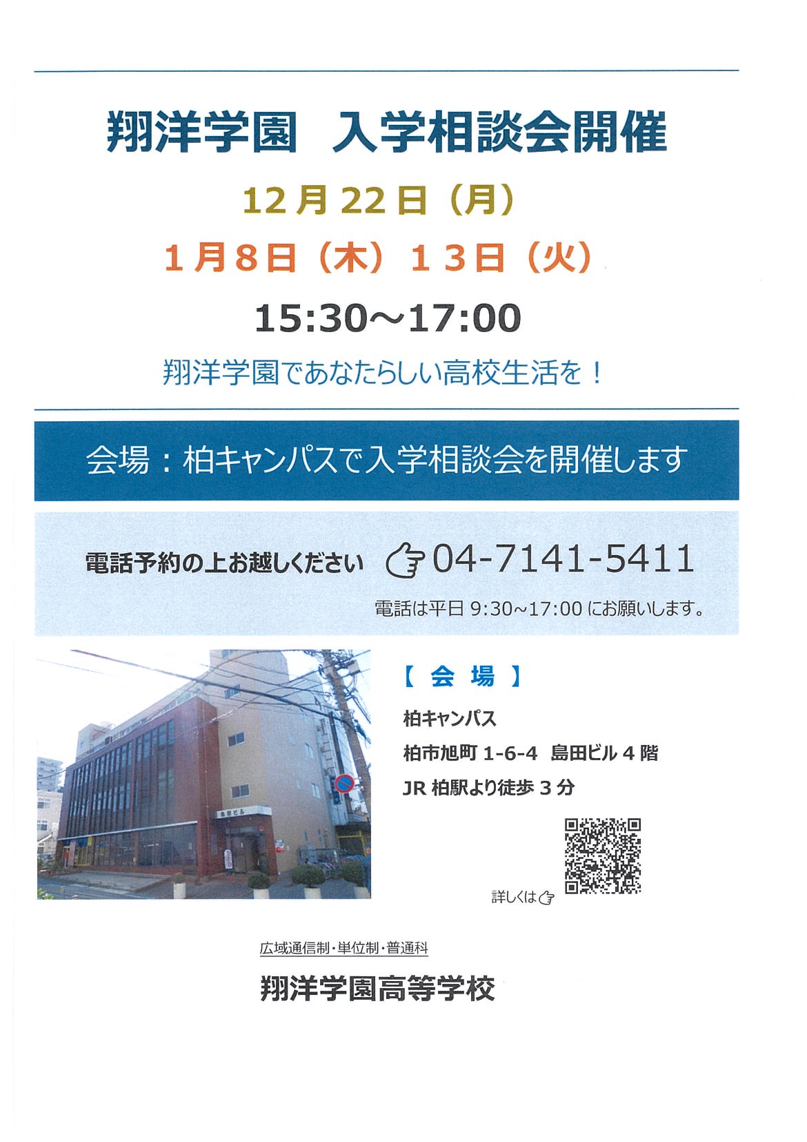 翔洋学園高等学校 日立本校 〒319-1221 茨城県日立市大みか町4丁目1番3号 TEL.0294-27-1101 FAX.0294-27-1102