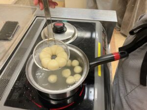 白玉粉と絹豆腐で生地を作り、団子の形に丸めていきます。